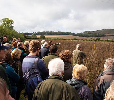The guests were then ushered to the trailer, to begin the conservation tour. A lucky break in the rain saw the sun shining for us as we were guided from point to point. The Butlers, joined by Mark Smith, FWAG SouthWest Farm Conservation Adviser for the area, Ben Dolbear and David Bright of Bright Seeds, and Simon Smart (PDFG), took the opportunity to show guests various areas of the farm, discussing the seed mixes and options on the farm. We covered veteran trees, fauna poles, butterflies, hedgerows, field margins and corners, game cover, ponds and much more on the walk! An exceptional view of Martinsell Hill closed the walk, where guests returned to the pub for a hearty lunch.